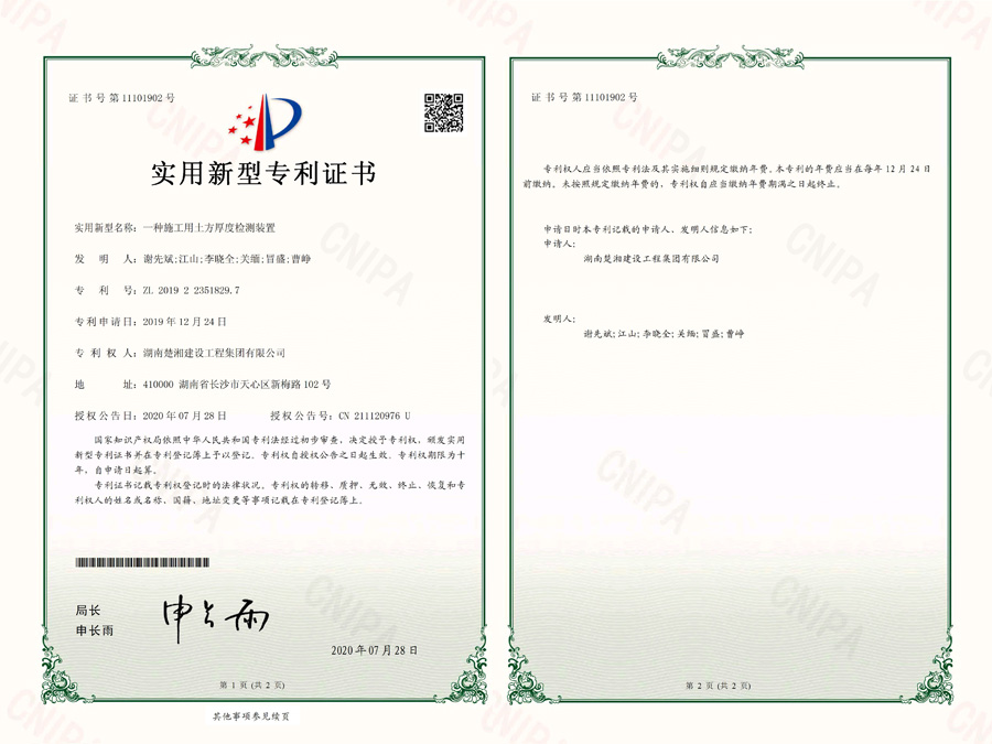2020年7月28日被授予“一種施工用土方厚度檢測(cè)裝置”專利-2019223518297-實(shí)用新型專利證書
